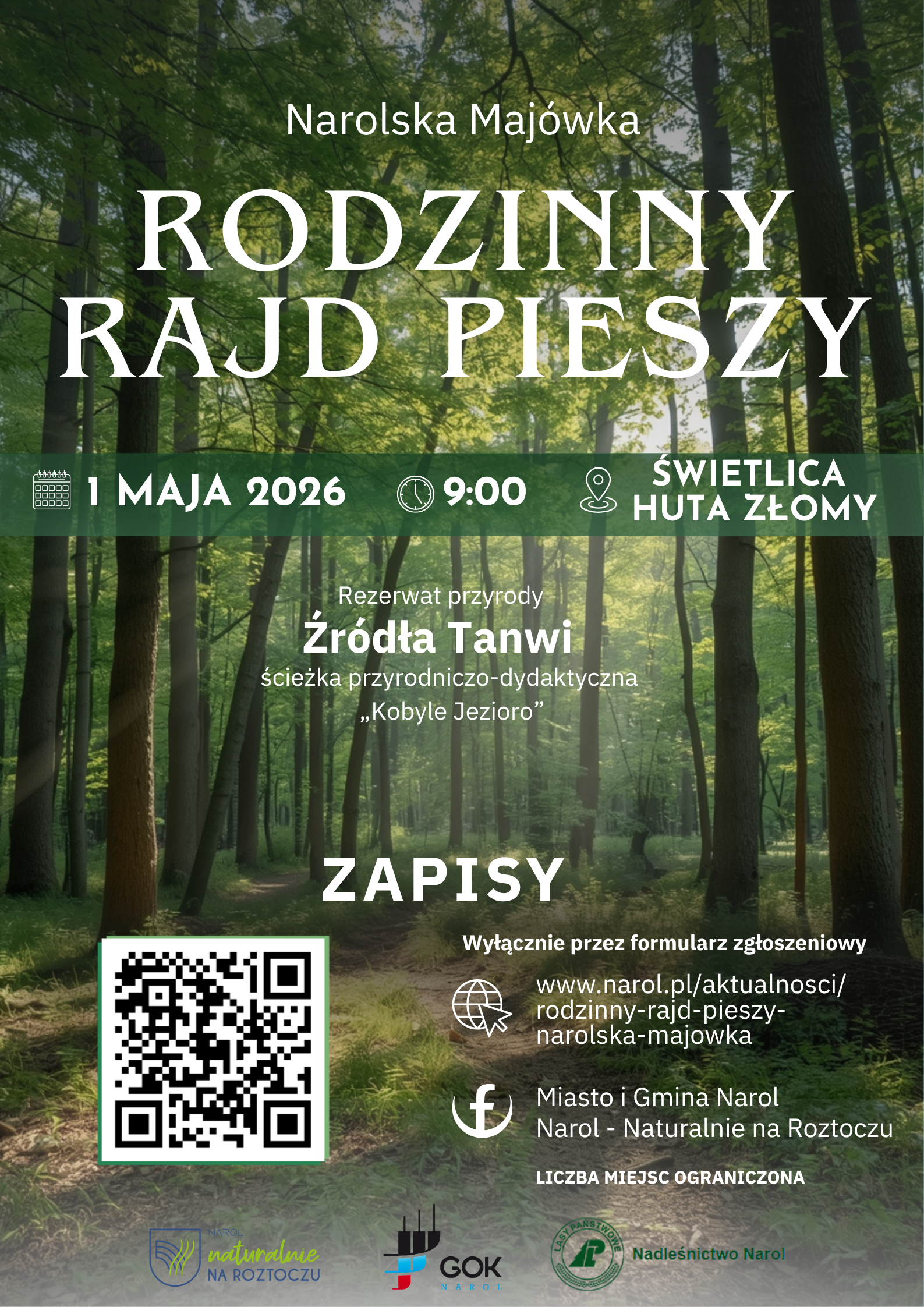 Udział w rajdzie możliwy jest wyłącznie po wcześniejszym zgłoszeniu poprzez formularz dostępny online na stronie Urzędu Miasta i Gminy Narol https://narol.pl/aktualnosci/rodzinny-rajd-pieszy-narolska-majowka.html. Zapisy trwają do 17 kwietnia lub do momentu wyczerpania limitu miejsc, który wynosi 70 uczestników. Po potwierdzeniu udziału należy uiścić opłatę wpisową w wysokości 20 zł od osoby na konto Gminnego Ośrodka Kultury w Narolu.
