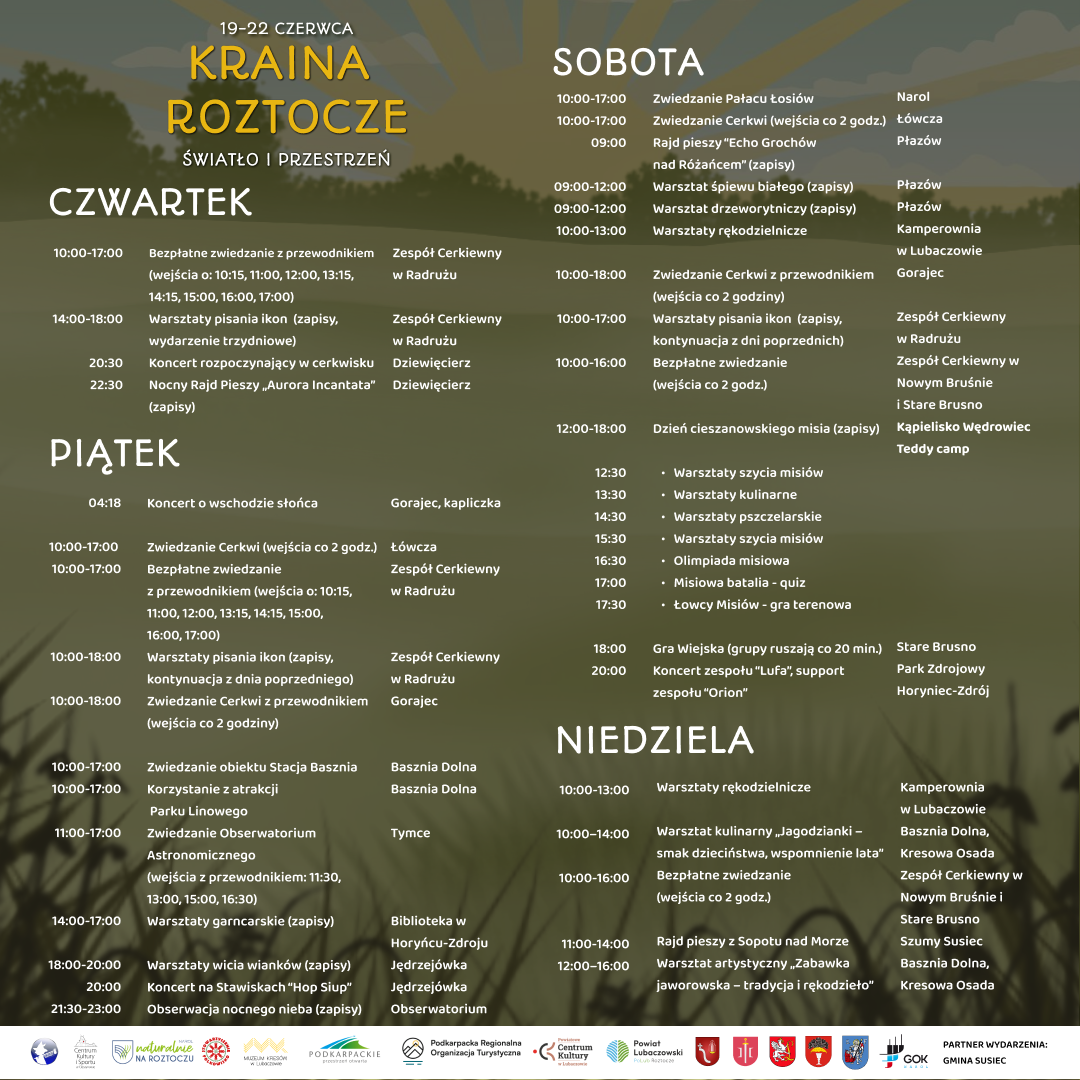 W programie znajdziemy m.in. warsztaty pisania ikon, śpiewu białego, garncarstwa, drzeworytnictwa, a nawet szycia misiów i wicia wianków. Miłośnicy muzyki będą mogli uczestniczyć w koncertach – m.in. o wschodzie słońca w Gorajcu, cerkwisku w Dziewięcierzu czy Parku Zdrojowym w Horyńcu Zdroju.