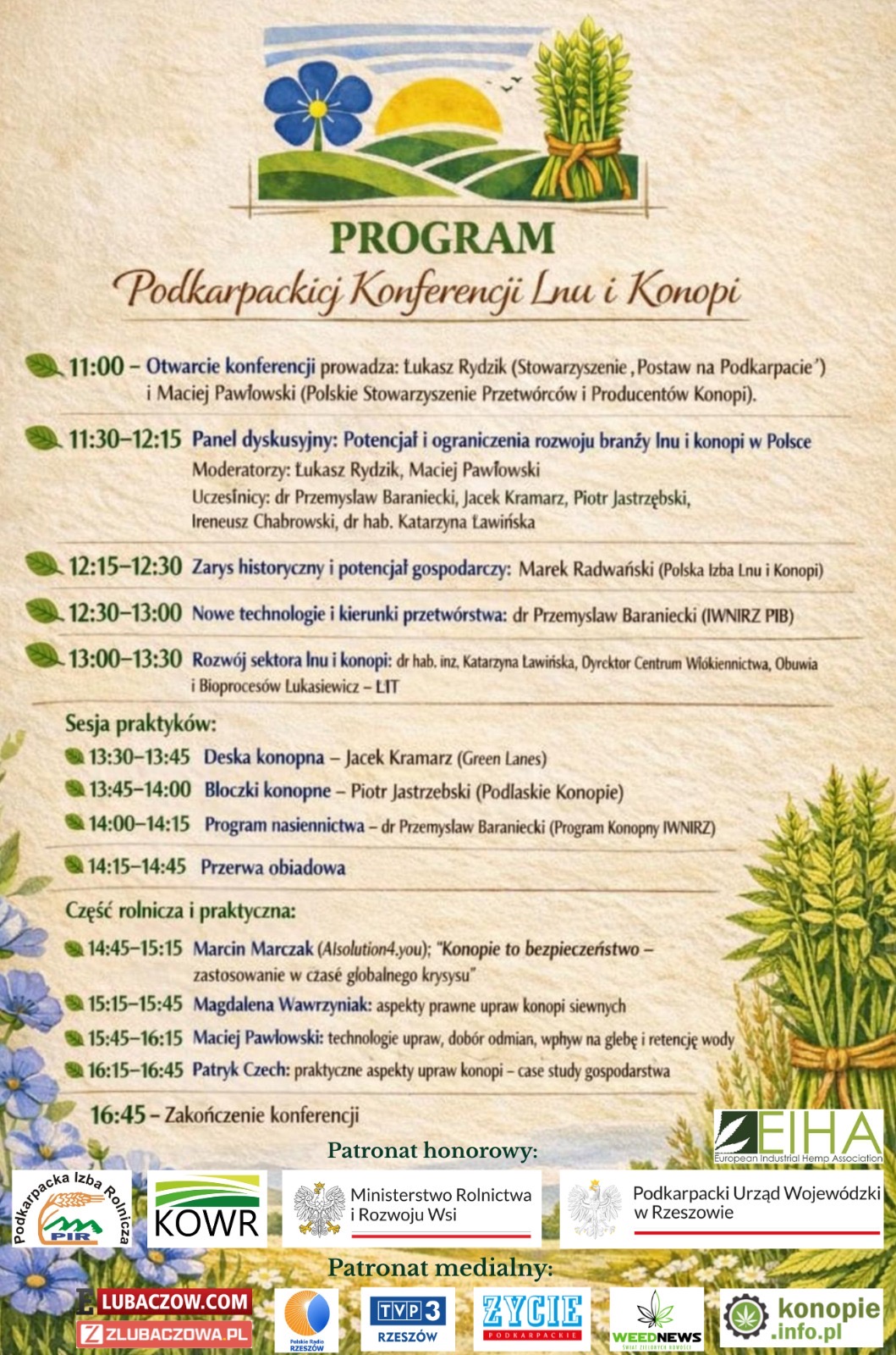 W dalszej części programu przewidziano wystąpienia poświęcone historii i potencjałowi gospodarczemu lnu oraz konopi, nowym technologiom przetwórstwa oraz przykładom działających wdrożeń rynkowych. Swoje prezentacje przedstawią m.in. Marek Radwański z Polskiej Izby Lnu i Konopi, dr Przemysław Baraniecki z IWNiRZ PIB w Poznaniu, Jacek Kramarz z Green Lanes oraz Piotr Jastrzębski z Podlaskich Konopi. Agenda obejmuje również temat programu nasiennictwa – odmian i certyfikacji oraz wystąpienie dr hab. inż. Katarzyny Ławińskiej dotyczące aspektów rozwoju sektora lnu i konopi.